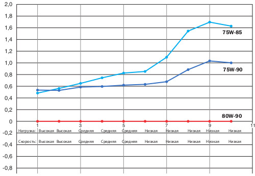 Масло TRAXON Synthetic 75W-90 обеспечивает более эффективный крутящий момент при любых скоростях и нагрузках по сравнению с маслами SAE 80W-90 GL-5(20–45 °C при умеренной нагрузке), что было доказано испытанием на эффективность крутящего момента FZG. Согласно результатам испытания, масла SAE 75W обеспечивают более низкое вязкостное сопротивление при более низких температурах по сравнению с SAE 80W во время фазы нагрева моста. Это особенно важно в условиях частых пусков и остановов, даже если смазочные материалы моста не достигают очень высоких рабочих температур.